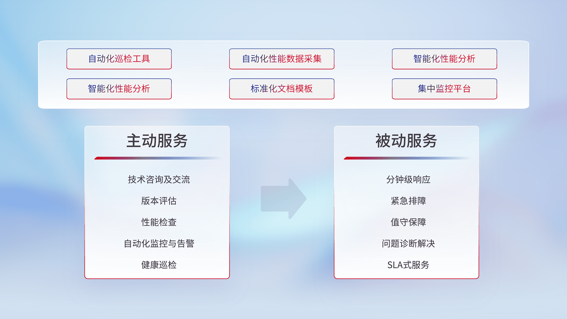 智能化工具和标准化文档,,保障服务质量,,提供主动服务(包含技术咨询、、、、版本评估、、性能检查、、、自动化监控与告警、、、健康巡检)和被动服务包含(分钟级响应、、紧急排障、、、、值守保障、、问题诊断解决、、、SLA服务)。。